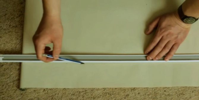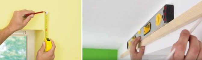 Mesurez la longueur de la pente supérieure et mettez un risque sur le mur opposé à son milieu, à partir duquel un segment est posé perpendiculairement vers le haut égale à la hauteur de conception des rideaux au-dessus de l'ouverture de la fenêtre. Une ligne horizontale est tracée à travers le point supérieur de ce segment à l'aide d'un niveau à bulle, sur lequel le rouleau ou la corniche supérieure du store sera situé.
