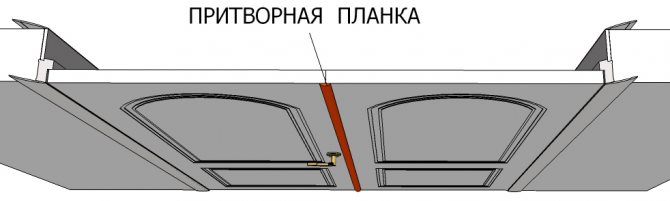 Si le rail est installé sur une cloison intérieure à deux vantaux, il doit nécessairement dépasser la partie du châssis qui s'ouvre en premier à la sortie. La bande installée à l'arrière du vantail de porte non fonctionnel agira comme une boîte, fermant l'espace entre les vantaux.