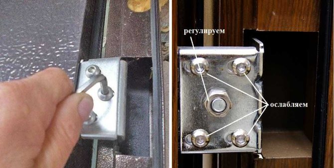 Si le vantail est déplacé par rapport à la porte dans le plan horizontal, nous essayons d'éliminer le courant d'air sous la porte d'entrée en déplaçant d'abord le vantail de la porte. Ceci est décrit ci-dessus: desserrez les vis de fixation sur les charnières, puis essayez de déplacer la toile dans le bon sens. Vérifiez le résultat - le jeu a disparu - serrez toutes les vis dans leur position d'origine.