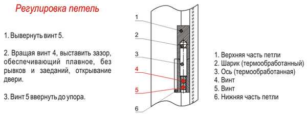 Les charnières standard ne sont pas réglables. Dans ce cas, le réglage des portes d'entrée consiste à remplacer la rondelle. Ils sont sélectionnés d'épaisseur plus ou moins grande, en ajustant la position du vantail de la porte. Certaines charnières à boule ont une vis de réglage. En le dévissant, nous soulevons légèrement les portes, en tordant - nous l'abaissons. Vous pouvez essayer de régler la situation avec.
