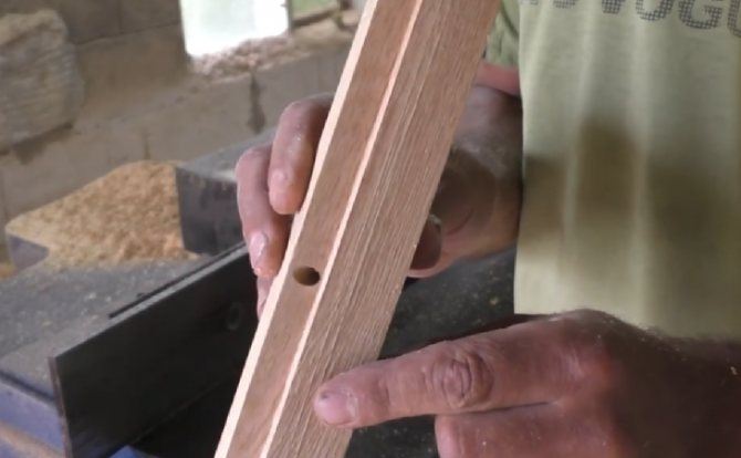 Pour fabriquer l'appareil, vous avez besoin d'une barre en chêne d'une section de 40x40 mm. Nous coupons un bord du bloc de bois sur toute sa longueur. Le bloc est positionné sur une perceuse et percé exactement en diagonale.