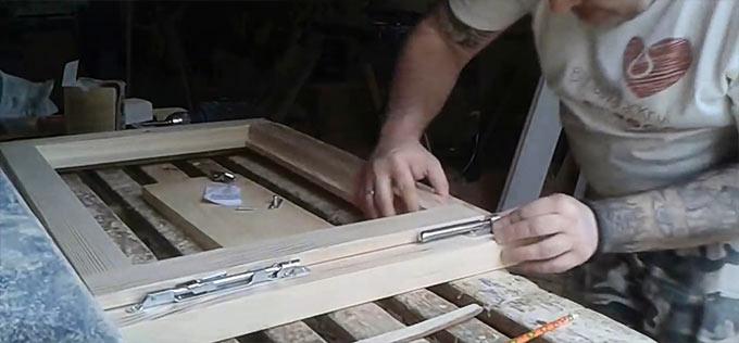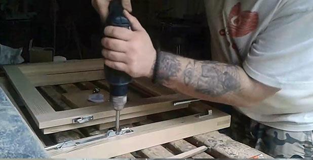 Les charnières en plastique et en bois sont installées sur de petites structures légères. Pour les modèles plus lourds, des modèles métalliques sont utilisés. Pour installer les charnières, un trou est percé en bas et en haut du cadre de la fenêtre et dans le châssis. Les charnières sont montées sur le châssis, alignées et sécurisées. Le châssis de la fenêtre est placé sur des charnières prêtes à l'emploi. Lors de la fabrication d'un profilé en bois pour les fenêtres de leurs propres mains, des trous sont percés dans le cadre pour installer la poignée. Le produit y est inséré et vissé avec des vis.