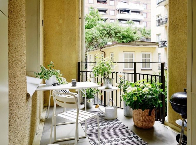 Au printemps et en été, un véritable paradis des fleurs peut être aménagé sur le balcon. Achetez des fleurs en palettes, suspendez des pots au-dessus de votre tête et dégustez un café à l'ombre à une petite table le matin. Si le balcon est vitré, cela peut être fait toute l'année!
