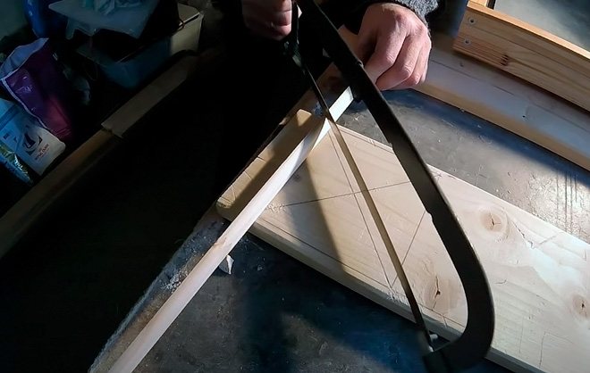 Le deuxième côté de la vitre est fermé par une perle de vitrage. Le verre tiendra ainsi, la perle de vitrage est ici plus une fonction décorative. Le cordon doit être coupé à 45 degrés. Cela nécessite une boîte à onglets en plastique bon marché. Mais si ce n'est pas là, peu importe: vous pouvez dessiner une boîte à onglets virtuelle et naviguer à côté. L'agrafe est étroite, les inexactitudes de quelques millimètres seront donc invisibles.