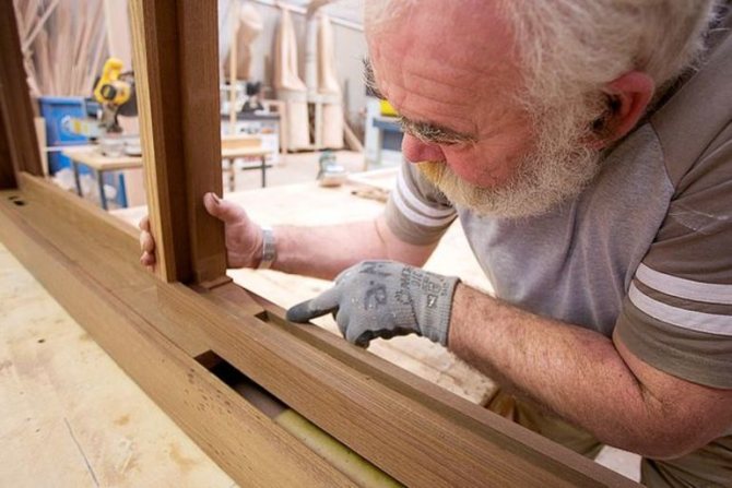 Lorsque toutes les pièces en bois et le verre sont préparés, ils commencent à assembler la fenêtre. Le processus commence par l'accouplement des pièces qui composent la boîte. Le plus souvent, le principe de la rainure d'épine est utilisé pour connecter des pièces. D'un côté, on choisit des pointes dont la longueur est égale à la largeur de la planche opposée. Des rainures sont découpées sur la deuxième planche.