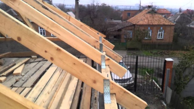 - Si la largeur du toit est supérieure à 8 m, des entretoises doivent être installées sur tous les chevrons. Ils sont fabriqués à partir de planches bordées et montés à un angle de 45 degrés. La partie inférieure de l'entretoise est fixée au lit et la partie supérieure au chevron à l'aide de plaques métalliques.