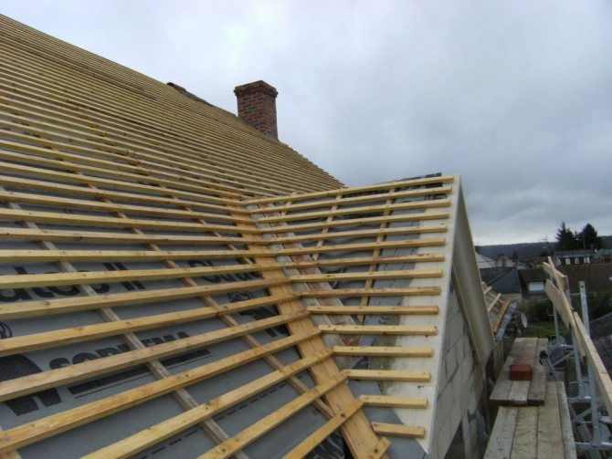 La distance entre les panneaux de revêtement est déterminée en fonction du matériau de toiture et de son poids. Par exemple, pour une tôle profilée, vous devez fabriquer une caisse avec un pas de 60 à 80 cm et pour un toit souple, vous devez faire une caisse continue. Dans tous les cas, vous devez préparer et aligner au mieux le cadre de revêtement pour le matériau de toiture. Sinon, des imperfections seront visibles, ce qui gâchera l'apparence du toit.