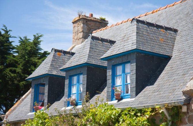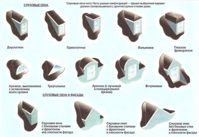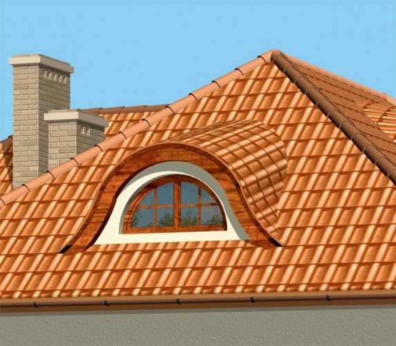 La fenêtre du grenier a un toit conçu selon les règles générales d'aménagement de la toiture. Le cadre de l'ouverture peut être dans le plan de la pente et être incliné, mais le plus souvent le cadre de la fenêtre est retiré et placé verticalement. Pour le "nichoir" résultant, un toit de différentes configurations est réalisé.