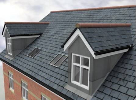 Les pentes au-dessus de l'ouverture sont correctement jointes au plan incliné du toit principal; des tabliers métalliques et des revêtements galvanisés sont utilisés.