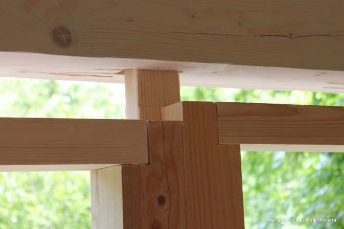 Les parties latérales de la fenêtre - les chariots sont constituées de blocs de bois dans lesquels des rainures sont découpées. Les projections sont coupées aux extrémités des bûches et, avec leur aide, le boîtier est mis en place. Un espace de 7 à 10 cm est laissé entre celui-ci et la bûche supérieure au-dessus de la fenêtre, qui diminuera ensuite progressivement sous l'influence du retrait.