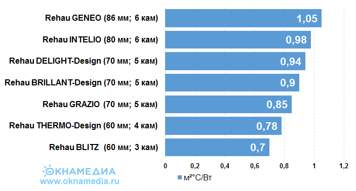 Considérons l'influence des caractéristiques du profilé sur l'isolation thermique des fenêtres en utilisant le profilé REHAU comme exemple. L'assortiment du fabricant comprend toute la gamme de systèmes, de l'économique au haut de gamme.
