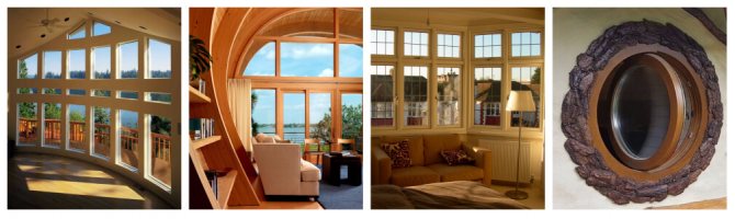 Les fenêtres en bois modernes sont équipées de ferrures de haute qualité, ce qui leur permet d'être en aucun cas inférieures en fonctionnalité à leurs homologues en plastique. Les systèmes Eurobeam collés peuvent être de n'importe quelle forme. Les chalets vous permettent de mettre en œuvre des solutions uniques qui sont inacceptables pour un appartement. Tout dépend uniquement des souhaits et des capacités financières du client.Les structures cintrées deviennent l'option la plus populaire aujourd'hui.