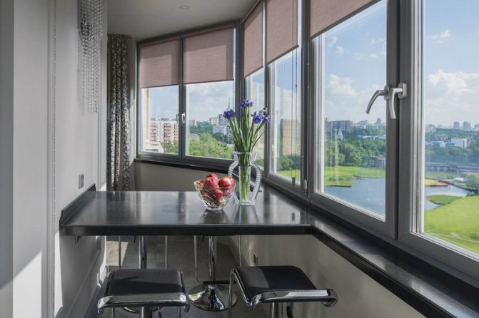 - Baie vitrée dans la conception de la cuisine. En règle générale, des types de baies vitrées polyédriques ou semi-circulaires sont utilisés. Il doit y avoir un espace libre entre les baies vitrées et les meubles de cuisine, sinon la pièce paraîtra plus petite. Les couleurs pastel à l'intérieur aideront à créer l'image d'une pièce lumineuse et remplie d'air.