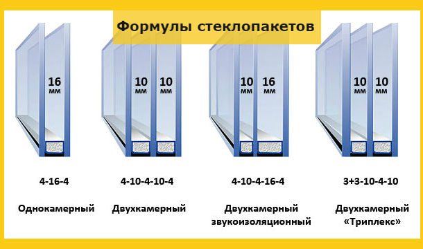 Comme le montre la figure, un certain nombre de formules pour les vitrages isolants sont utilisées. Il est évident qu'une augmentation de la largeur des chambres et de l'épaisseur du verre diminue la conductivité thermique. Mais une fenêtre en plastique résout également d'autres problèmes, par exemple la protection contre le bruit extérieur. Pour augmenter la protection contre le bruit, de telles solutions constructives sont utilisées comme la fabrication de fenêtres à double vitrage avec verre triplex, avec différentes largeurs de chambres.