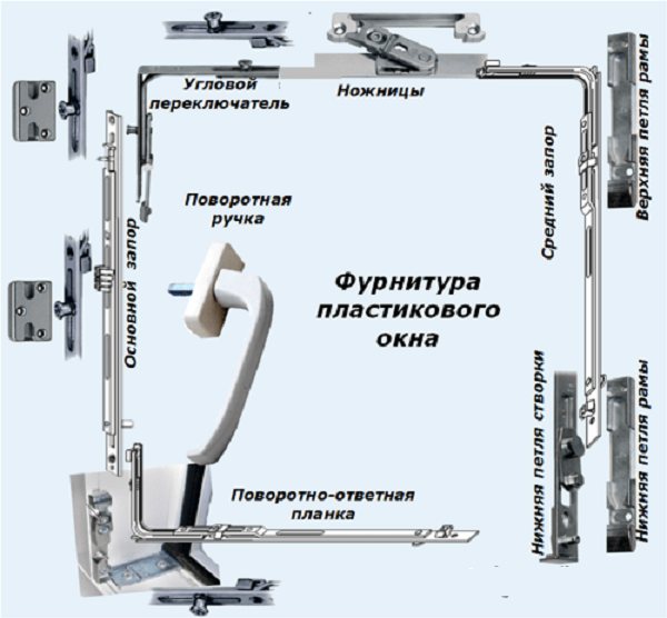 Il s'agit d'un ensemble d'éléments qui composent le mécanisme d'une fenêtre en plastique, vous permettent de fixer dans certaines positions, d'ouvrir et de fermer le châssis. Les éléments extérieurs visibles et utilisés de ce mécanisme sont les poignées rotatives, l'observateur extérieur voit l'autre partie du système lorsque les portes sont ouvertes. Nous ne décrirons pas comment les détails des ferrures pour fenêtres en plastique sont appelés, car ils sont représentés sur la figure.