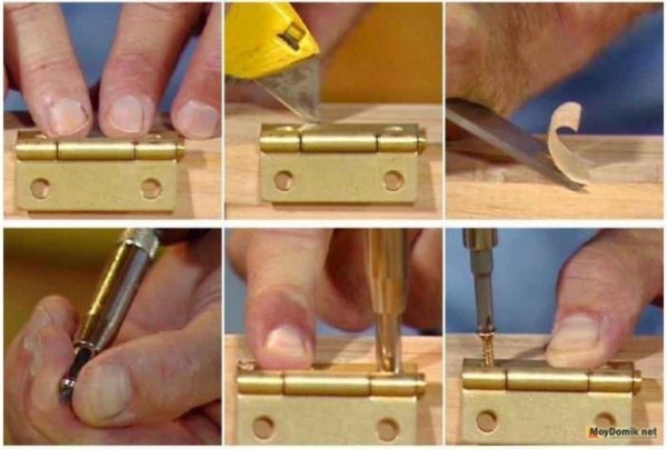 Si les anciennes charnières de fenêtre (auvents) sont usées, elles doivent être remplacées. La technologie de remplacement des charnières est illustrée ci-dessous. Vous devez d'abord déterminer correctement le point d'attache. Pour ce faire, le cadre de la fenêtre doit être inséré dans l'ouverture de la fenêtre et fixé avec des cales. Lorsque l'écart est le même sur tout le périmètre, nous marquons les emplacements d'installation. Avec un ciseau, nous choisissons une rainure pour planter la charnière et la fixons avec des vis autotaraudeuses.
