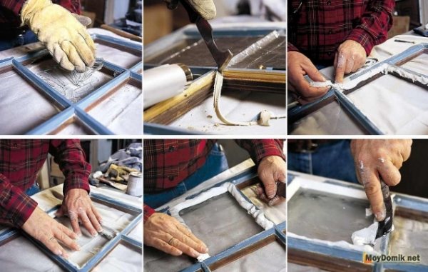 Vous trouverez ci-dessous une galerie de photos - une classe de maître sur l'installation de verre sur un mastic, sans parcloses. Par exemple, le verre est cassé, doit être remplacé, mais il n'y a pas de rail pour fixer le verre à portée de main, ou il n'y en a tout simplement pas besoin. Le mastic pour le verre est acheté prêt à l'emploi ou fabriqué indépendamment (mélange de craie sur de l'huile siccative).