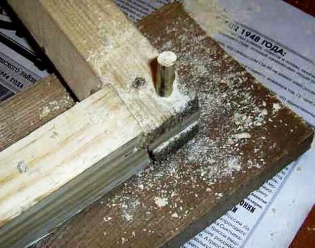 Ensuite, nous vérifions l'état et l'emplacement des goujons de fenêtre, en règle générale, les coins du cadre ont des connexions sur des goujons en bois. Par la suite (avant la peinture et le meulage), ils devront être remplacés par des neufs.