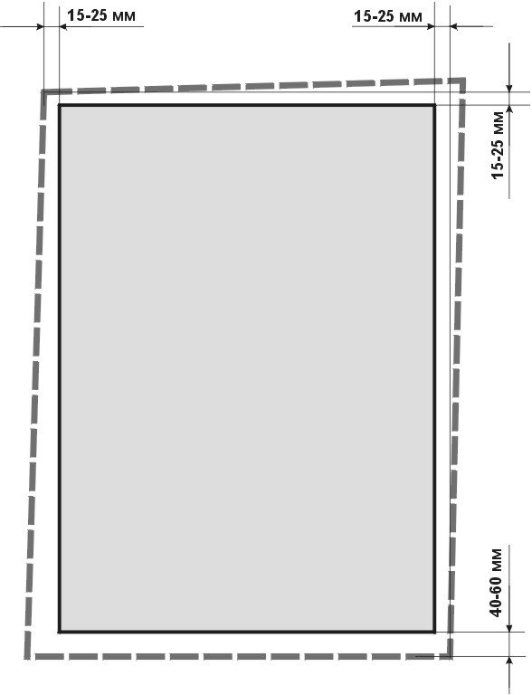 Même une maison construite par les constructeurs les plus consciencieux rétrécit avec le temps, et elle n'est jamais absolument uniforme. La nouvelle fenêtre doit être légèrement plus petite que le rectangle inscrit dans l'ouverture. Les jeux à respecter sont indiqués sur la figure: 15-25 mm sur les côtés et en haut et 40-60 mm en bas.