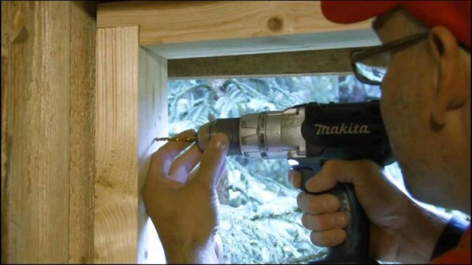 Après le perçage, les manchons sont enfoncés dans les trous, le cadre est à nouveau remis en place et, sans enlever les patins, ils sont fixés avec des clous. Ensuite, ils sortent les coussinets, soufflent les fissures avec de la mousse, font des pentes et mettent les châssis. Ceci termine l'installation.