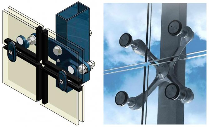 - Une araignée ou une solution plane est techniquement difficile. Les éléments de fixation dans ce cas sont des supports spéciaux en acier à haute résistance avec quatre bras. Chacun d'eux tient le verre à l'un des coins. Les araignées elles-mêmes sont fixées aux profils de montage en rack.