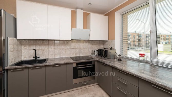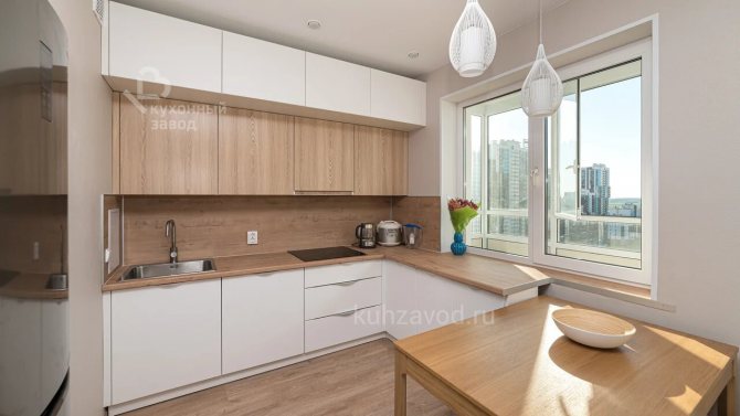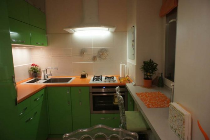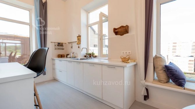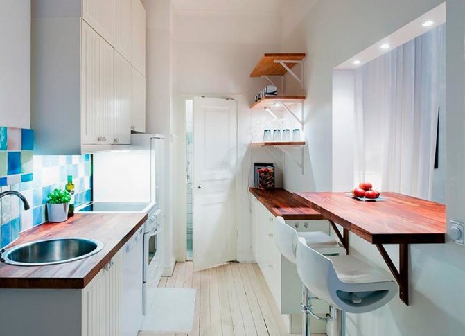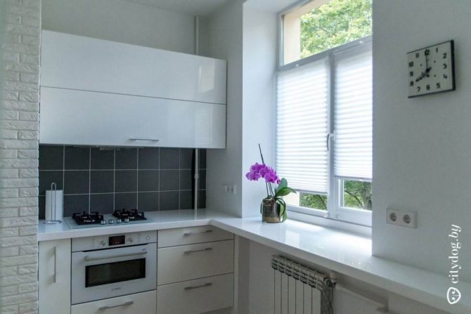Le comptoir d'une petite cuisine, installé perpendiculairement à la fenêtre, a également l'air original. Fixez le rack au mur avec le côté transversal. Il peut facilement remplacer une table à manger, mais avec cet agencement, la structure ne doit pas être haute.