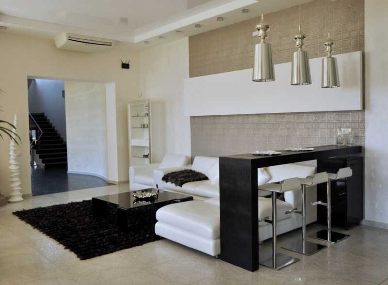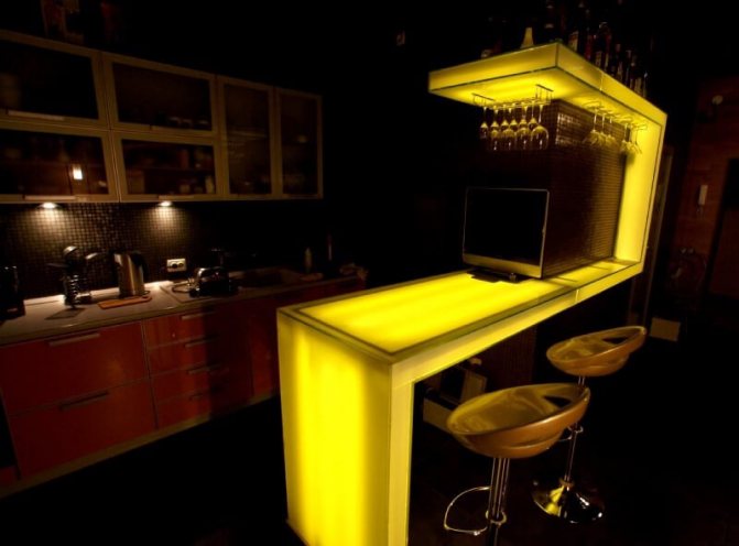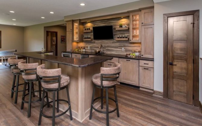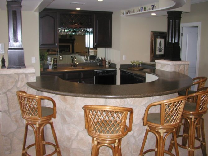 Le comptoir de bar donne à la conception de la pièce un aspect non standard, s'intégrant dans n'importe quel style de l'intérieur et le décore.