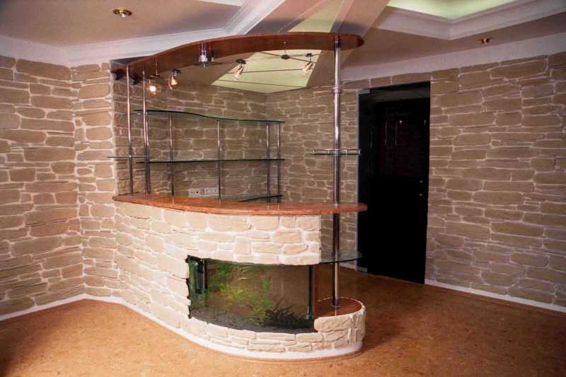 - Pierre artificielle ou naturelle. Le dessus de bar en pierre sera élégant. La pierre artificielle peut être utilisée pour la base (jambe) du support.