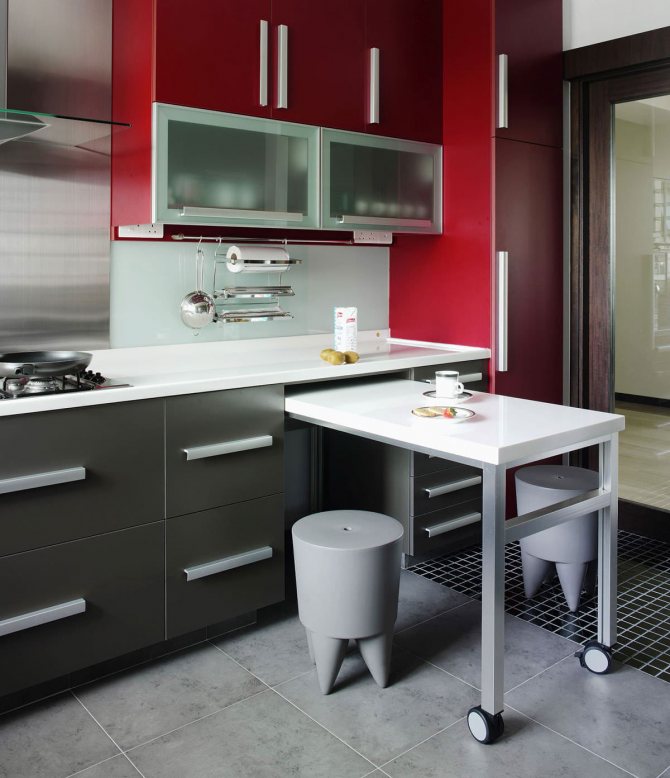 Pour les petits appartements, les modèles pliants sont pratiques, qui sont fixés avec des charnières au mur. La structure peut être abaissée et utilisée comme table.