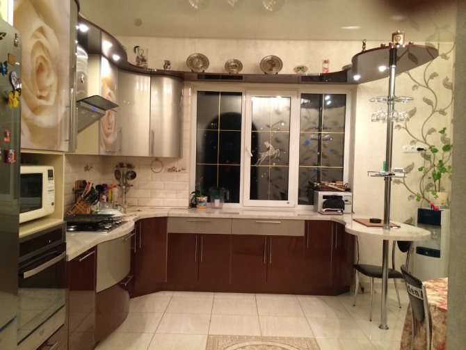 Le comptoir de bar près de la fenêtre peut être combiné avec un ensemble de cuisine, ce sera sa continuation, il sera placé sous la forme de la lettre P, fusionnant avec le comptoir. Avec cette option, le rebord de la fenêtre avec le comptoir sera situé au même niveau. Avec un rebord de fenêtre haut, vous pouvez équiper une structure à deux niveaux à proximité.