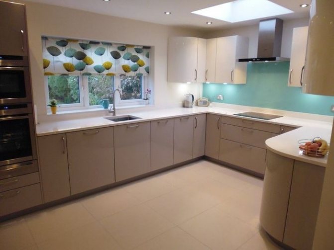 - Verre. Un verre trempé résistant aux chocs d'une épaisseur d'au moins 5 mm est utilisé, qui doit être renforcé, incassable. Un tel matériau ne se prête pas aux influences chimiques et mécaniques, il n'a pas peur de la chaleur. La surface en verre ajoute l'exclusivité à la pièce. Un tel matériau non standard convient au minimalisme et aux styles high-tech, laconiques et stricts, où il n'y a pas d'éléments décoratifs! Le comptoir en verre agrandit visuellement l'espace, laissant entrer la lumière à travers lui-même et crée des effets de couleur.