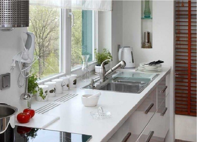 La façon la plus courante d'utiliser un rebord de fenêtre dans la cuisine est d'organiser un lieu de travail supplémentaire. Pour ce faire, il vous suffit d'installer un plateau supplémentaire sur toute la longueur du rebord de la fenêtre. Si vous essayez un peu, alors sur le rebord de la fenêtre, en plus du comptoir, vous pouvez même installer un évier. Le granit ou le marbre sont les meilleurs matériaux pour fabriquer des comptoirs. Ces matériaux sont capables de résister parfaitement à une humidité élevée et à des changements de température importants. Un plateau de table en pierre naturelle ne changera pas de forme avec le temps, ne se dessèchera pas et ne gonflera pas. Le comptoir en pierre résiste aux dommages mécaniques. De plus, un tel plan de travail a une belle apparence qui rendra l'intérieur de la cuisine plus sophistiqué.