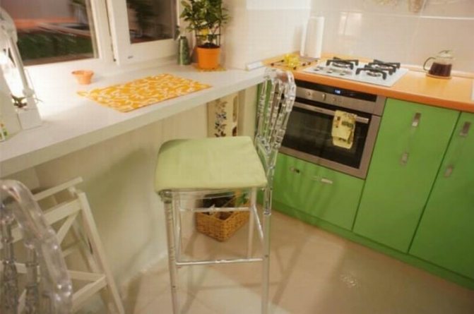 Dans les petites pièces, les appuis de fenêtre ne semblent pas attrayants. Ils sont soit vides, soit de petites choses s'y accumulent, qui s'ajoutent à la hâte. En installant le comptoir de bar, vous pouvez obtenir un comptoir à partir du rebord de la fenêtre de la cuisine. L'essence de la conception est que le rebord de la fenêtre deviendra un espace de travail confortable, il peut être utilisé comme table à manger et comme lieu de collations. La zone utile de la cuisine n'est pas perdue lorsque le bar est situé près de la fenêtre.