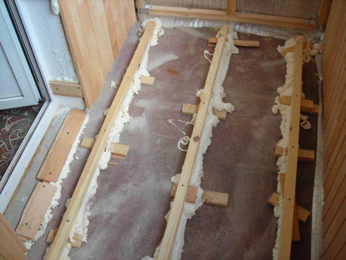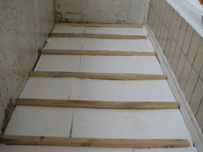 L'installation d'un retard est une étape cruciale de l'installation, à ce moment le nivellement du futur plancher est effectué horizontalement. La position de chaque bûche est vérifiée avec un niveau, s'il y a un rouleau de la base en béton du balcon ou son inégalité, aux bons endroits, la hauteur de la bûche est ajustée avec une doublure en bois ou en plastique. Une fois fixé, comme le retard lui-même, il est cousu avec une vis autotaraudeuse.