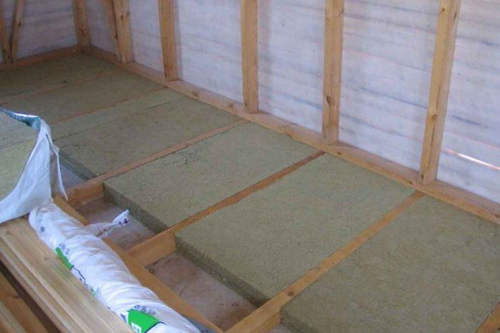 L'isolation est placée dans l'espace entre les décalages, c'est possible un peu avant d'atteindre leur niveau supérieur. L'espace rempli d'air devient une isolation thermique supplémentaire. La découpe des matériaux isolants se fait facilement avec un couteau de bureau ou de construction. Un film est posé sur la couche isolante, il peut être fixé aux bûches à l'aide d'une agrafeuse de construction.