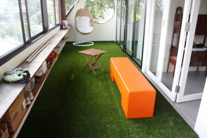La moquette du balcon est une finition plutôt exotique. Cependant, pour un balcon isolé et vitré, ce serait une excellente option. Un tel revêtement de sol est très agréable au toucher, bien qu'il soit inférieur en résistance à l'usure à d'autres types de revêtements de sol.