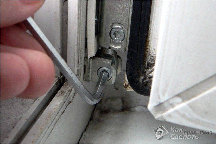 L'élimination d'un tel problème est également réalisée au moyen d'un hexagone, ce n'est que maintenant qu'il est inséré dans les trous des charnières faisant face, comme on le voit sur la photo, à l'intérieur de l'ouverture. Pour rapprocher l'ouvrant du cadre, ou vice versa, le déplacer vers l'arrière, vous pouvez tourner la clé hexagonale dans un sens ou dans l'autre.