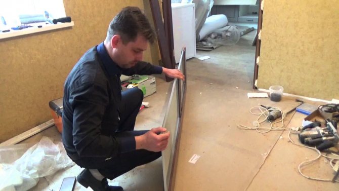 Lors de l'installation d'un élément en verre entre des panneaux MDF, le tissu est collecté sur une surface horizontale. Pour installer le verre, les superpositions sont le plus souvent utilisées, qui sont attachées aux clous.Lors de l'installation de l'insert et de l'enfoncement de petites fixations dans une porte en bois, il faut faire attention à ne pas casser la vitre: un faux mouvement entraînera des réparations répétées. Soulevez le vantail assemblé et placez-le dans les glissières du profilé de porte coulissante.