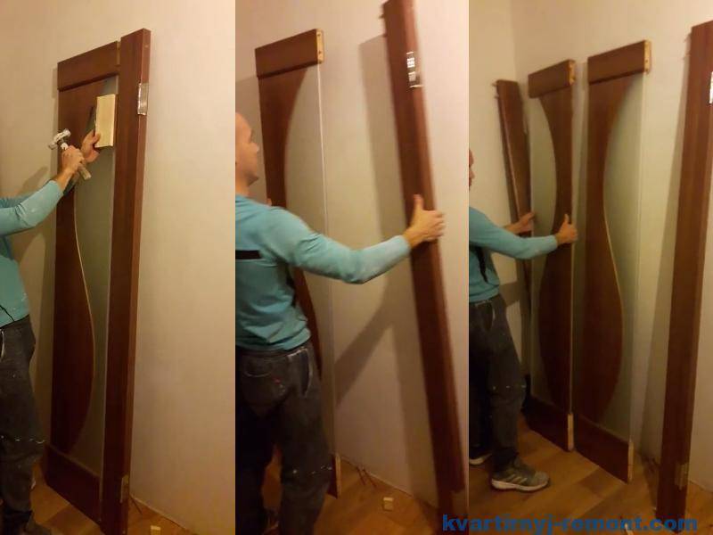 Et la dernière action avant de remplacer la vitre de la porte intérieure est de retirer la porte elle-même de ses charnières et de la placer de manière à ce qu'elle soit pratique. Bien sûr, vous pouvez effectuer cette opération directement sur place, mais ce sera plus pratique, et retirer les portes modernes est une question de quelques secondes, même un assistant n'est pas nécessaire. Ouvrez simplement la porte, soulevez-la et c'est tout.