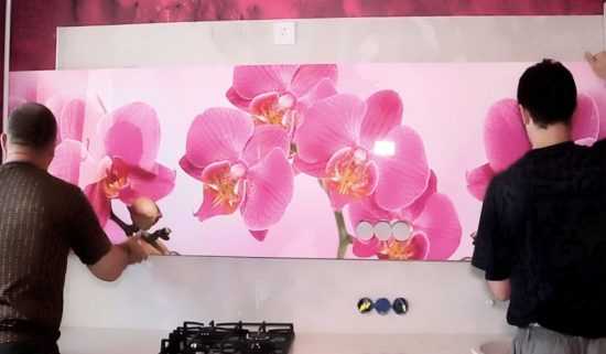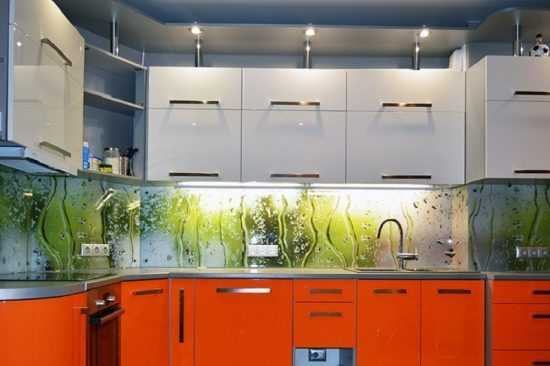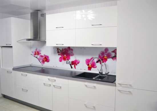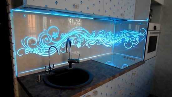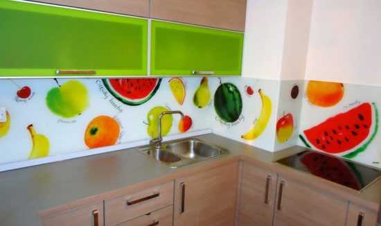 - coût - s'applique à la fois au matériau et à la conception. Un écran en verre avec impression photo pour une cuisine en MDF coûtera jusqu'à la moitié du casque complet. Une feuille de polycarbonate avec un film décoratif est tout aussi belle et coûte beaucoup moins cher.