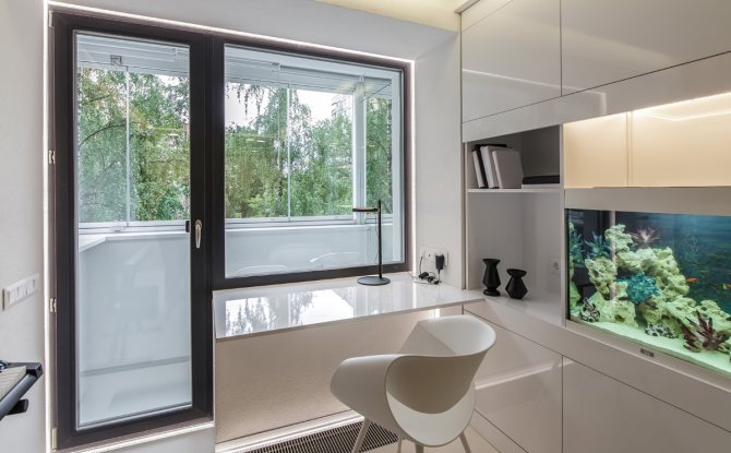 S'intègre parfaitement dans un balcon avec une finition claire, car la lumière du jour et les couleurs claires créent une atmosphère chaleureuse. Sur fond de cadres blancs et de murs clairs, les planchers en bois ou le stratifié brun foncé ont l'air bien.