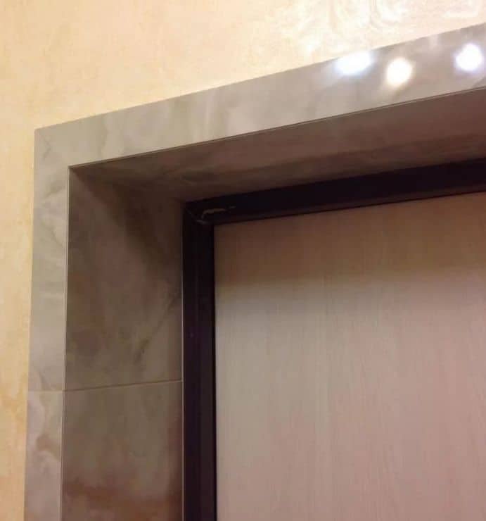 - Le plateau correctement installé aligne visuellement le cadre de porte intérieur. Même si le cadre a été installé dans l'embrasure de la porte avec une légère erreur, vous pouvez toujours installer les plateaux sur la porte à angle droit afin que l'ensemble de la structure soit parfaitement plat;