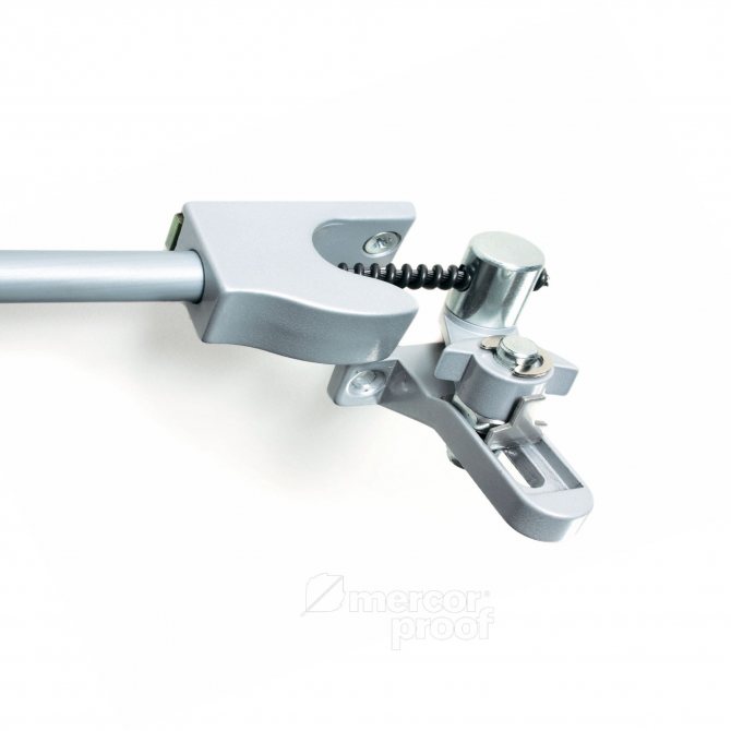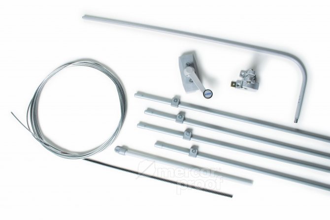Le mécanisme se compose de ciseaux mobiles, d'une équerre, d'une tige, d'une poignée et d'un couvercle décoratif. Toutes les parties visibles sont en aluminium anodisé, couleurs standard blanc, argent, marron foncé, RAL sur demande.