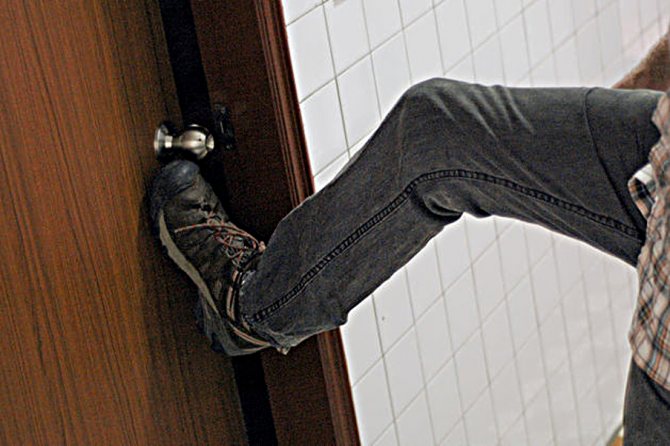 Il existe un autre moyen simple et efficace d'utiliser la force brute. Si la porte s'ouvre vers l'intérieur, vous pouvez simplement l'assommer d'un coup sec. Bien sûr, dans ce cas, le cadre de la porte sera endommagé, mais il existe de nombreuses méthodes pour le restaurer.