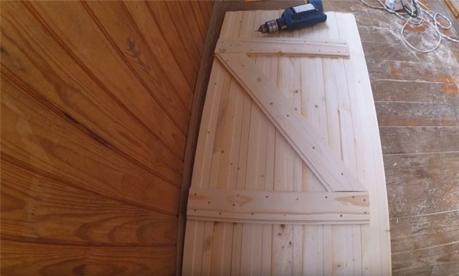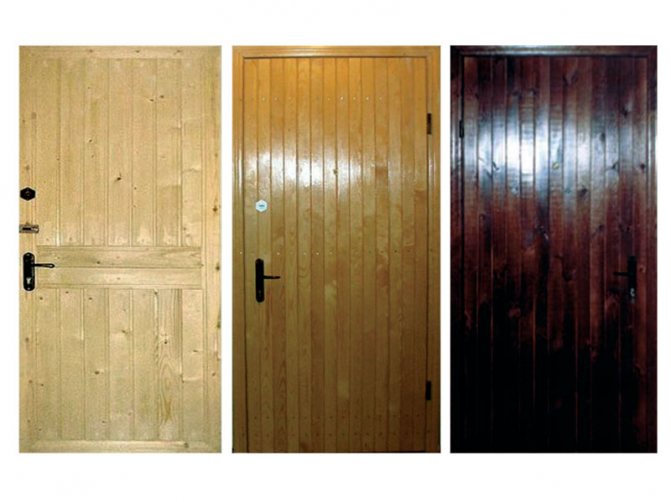 Ensuite, les ferrures sont installées, y compris la serrure et les charnières. La porte de la doublure est accrochée au cadre. Si vous le souhaitez, une planche de contreplaqué est insérée dans la rainure. Ensuite, la structure est recouverte de planches. La toile résultante est apprêtée, vernie ou peinte.