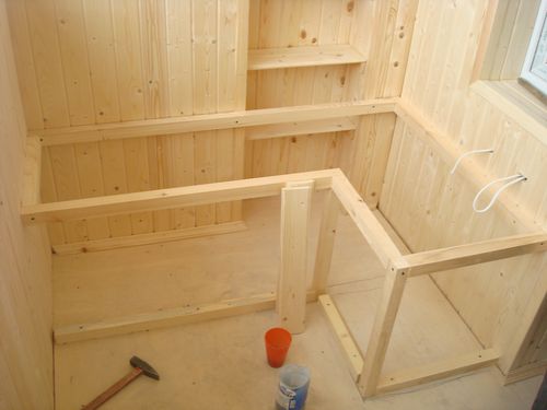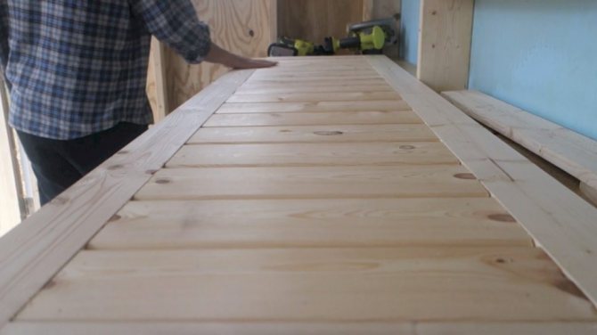 L'étape suivante consiste à couper la doublure d'une longueur de 68 à 70 cm et un total de 40 lattes sera nécessaire. Le matériau est inséré dans la rainure des éléments de porte verticaux, en les fixant avec des clous. Le pré-assemblage est complété par la 1ère planche de pin courte. Le bois est inséré dans l'espace restant. Une courte planche de pin est insérée au milieu de la structure (pour chape).