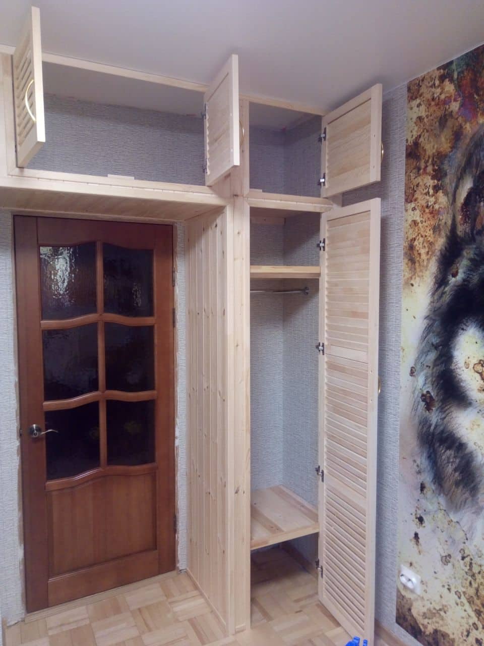 Lorsque les parois arrière et latérales de l'armoire sont invisibles, le revêtement consiste en la fabrication de portes. En fonction des préférences du propriétaire des locaux, leur taille et leur nombre sont sélectionnés.