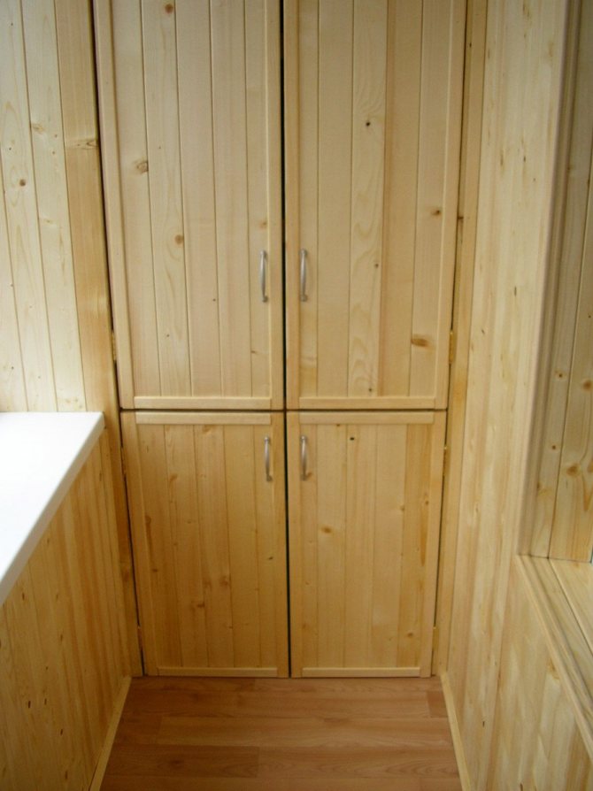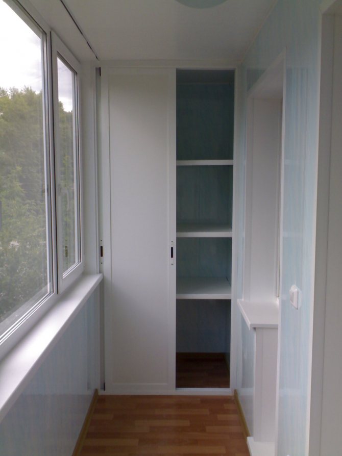 S'il y a une niche au bout du balcon, c'est un endroit idéal pour monter l'armoire. En fonction de la taille et de la forme de votre balcon, vous pouvez envisager deux options pour l'armoire: le coin et le mur. En fonction de l'espace dont vous disposez, vous pouvez équiper la structure de différents types de portes.