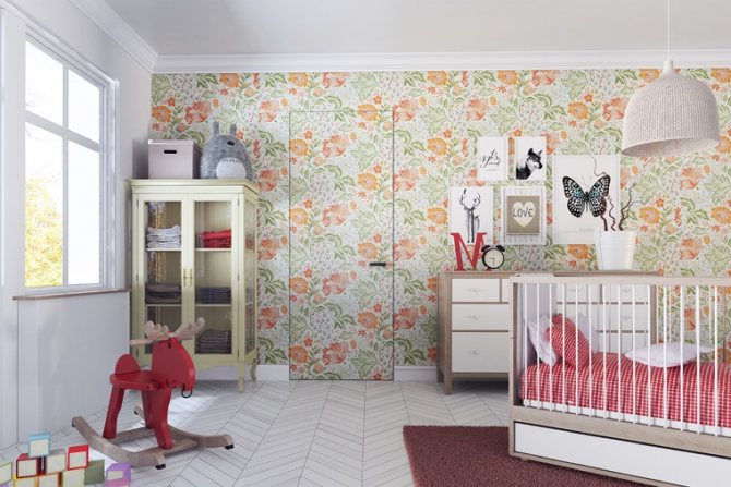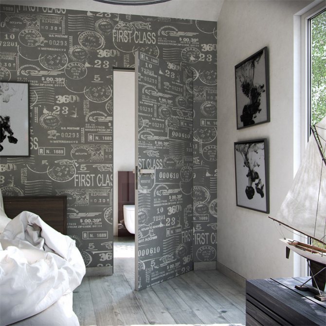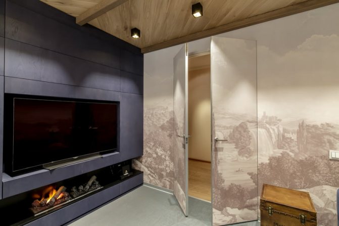 Cette conception vous permet de transformer la porte en mur. La toile est pratiquement invisible sur le fond de la décoration murale. Lors de la décoration des intérieurs, de nombreux designers essaient de s'assurer que la porte est finie dans le même style que le mur.