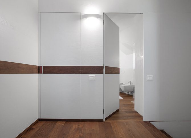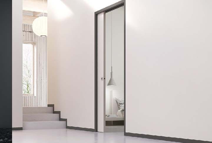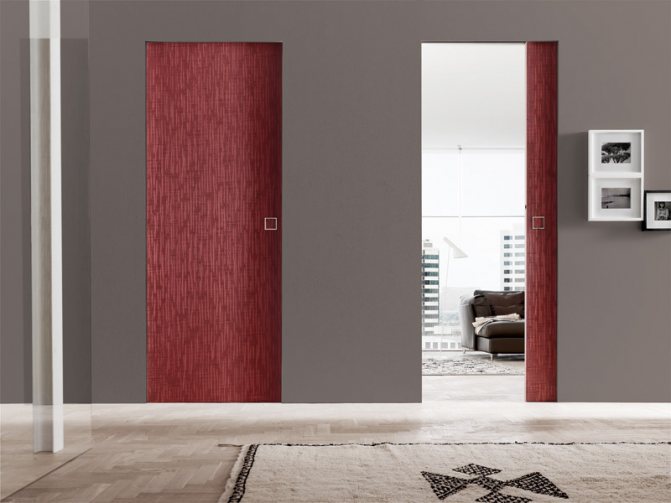 Entièrement intégré dans les murs. La meilleure façon dont ces portes s'intègrent dans des pièces avec un grand nombre de portes. De telles options de porte aident à cacher diverses pièces de service.- Un peu d'espace est utilisé pour l'installation. Cette fonctionnalité vous permet d'installer dans une ouverture étroite où une toile standard ne rentre tout simplement pas.